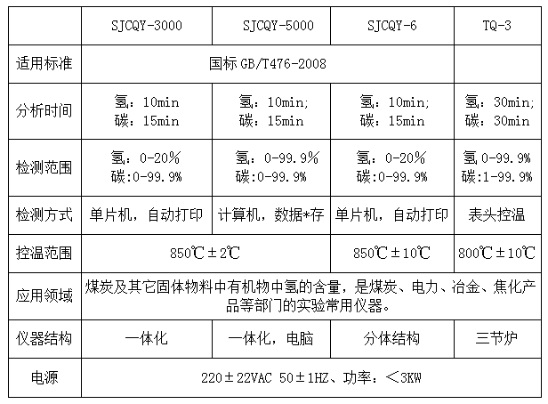 测定结果符合国标GB/T476-2008。适用于测定煤炭及其它固体物料中有机物中碳、氢的含量,是煤炭、电力、冶金、焦化产品等部门的实验常用仪器