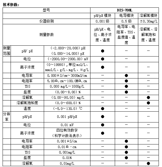 l 仪器支持pH/pX模块、电导模块、溶解氧模块;支持测量模块的任意组合使用,最多允许连接4套任意类型的测量模块,即插即用;