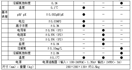 l 支持电极管理,最多可管理5支pH电极、5支离子电极、5支ORP电极、5支电导电极和5支溶解氧电极;每支电极可保存20套校正记录;支持校准编辑功能,方便校准;