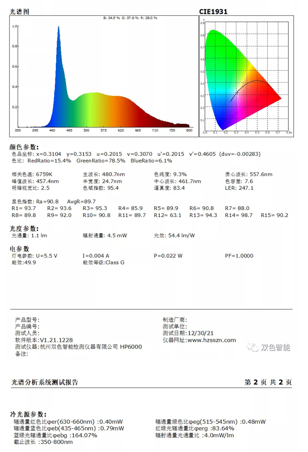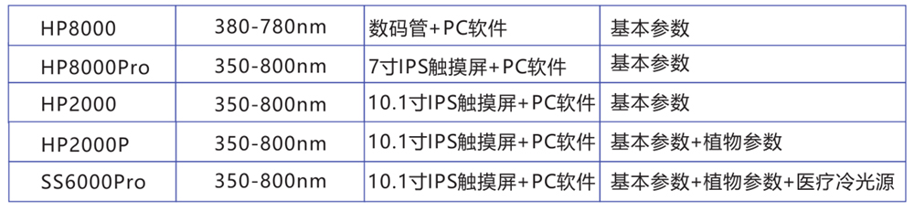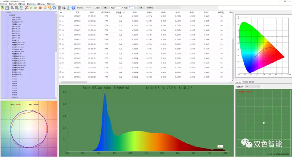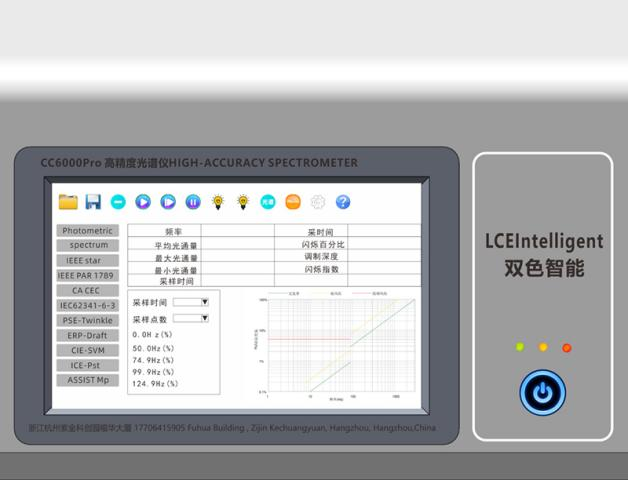 主要参数:色温、波长、光通量、显色指数、色容差、辐射功率、红色比、蓝色比、绿色比、PPF、PPE、PRF、Kprfv、色域指数(Rg)、逼真度(Rf)、色质指数CQS、电流、电压、功率、功率因素、光效等