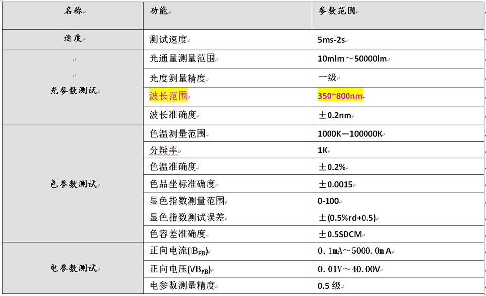测试相对光谱功率分布,色品坐标,主波长,色纯度,峰值波长,色温,显色指数,半宽度,光通量(配积分球),辐射功率,红色比,色容差等参数,满足国际照明委员会CIE对光和颜色测量要求。