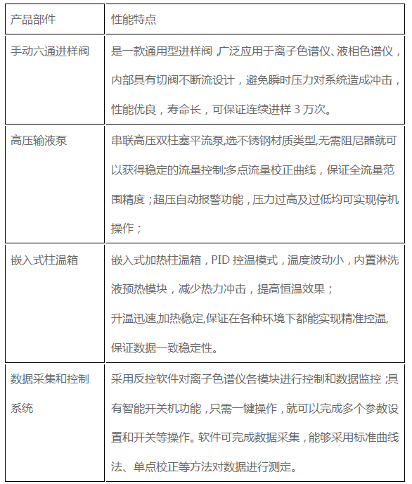 抗污染,耐压高,寿命长;兼容100%有机溶剂;可匹配国产及进口等多款同类型离子色谱产品;信号线采用航空接口连接,拆装方便;